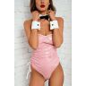 Сексуальный лаковый костюм Зайка выполнен в розовом цвете и состоит из комбидресса, ушек, бабочки и манжет. Боди украшено шнуровкой на спине. Костюм упакован в потрясающую подарочную упаковку, с игривым перышком внутри.