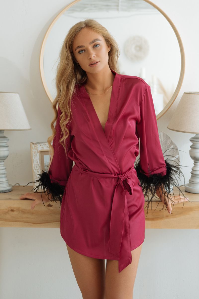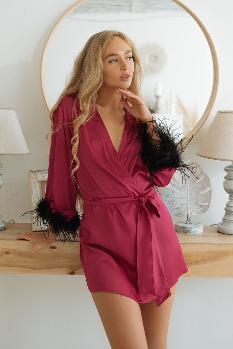 Самый эффектный укороченный халат с боа из малинового армани шелка,вызывающий бурю эмоций и восхищений, глядя на тебя. Он так нежно обволакивает твое тело, создавая эффект "второй кожи", придавая тебе уют и непревзойденную элегантность. Халат с боа станет идеальным образом для домашнего использования, а также, сняв боа, которые легко отстегиваются, накинув его поверх мини-платья, шикарной накидкой для выхода в свет.