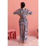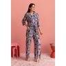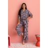 Комплект из туники и брюк, выполнен из принтованной вискозы. Туника свободного силуэта. Полочка укороченная, с застежкой планкой на пуговицах и отложным воротником. Спинка удлиненная, горловина на спинке обработана обтачкой. Разрезы в боковых швах. Рукав 7/8 с разрезом по верхнему шву. Брюки с карманами, свободного силуэта с разрезами по передней детали. Пояс на завязке-кулиске и эластичной ленте.