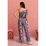 Комбинезон брючный женский, длинный с карманами, из принтованной вискозы. Ассиметричное решение верха, короткий цельнокроеный, спущенный рукав на правое плечо и бретель на левое плечо из основного полотна с регулировкой. Верхняя и нижняя часть соединённые по линии талии. Пояс-кулиска на эластичной тесьме. Крой брюк свободный, прямой.