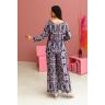 Комплект из туники и брюк с запахом, из принтованной вискозы. Туника средней длины прямого силуэта, рукав реглан. Горловина обработана обтачкой. Вырез горловины лодочка на полочке и V-образный на спинке. Удлиненная деталь спинки. Разрезы в боковых швах. Брюки с запахом, свободного силуэта. Отлетная деталь(юбка) на поясе - завязке. Пояс на эластичной тесьме.