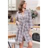 Короткий запашной халатик Mia-Amore выполнен из натурального хлопкового полотна с рисунком в виде серо-розовой клетки. Борт, низ рукавов и кармашки декорированы розовым кантиком.