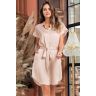 Туника Mia-Amore с коротким цельнокроенными рукавами с центральной застежкой на пуговицы выполнен из мягкого однотонного креп-сатина. На спинке кокетка со встречной складкой. Низ туники имеет фигурную форму. Туника по талии затягивается поясом. В боковых швах карманы.