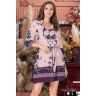 Халат Mia-Amore длиной до колен с рукавами длиной 3/4, с центральной застежкой на пуговицы выполнен из принтованного вискозного полотна. Борт, воротник отделаны кантом. По низу халат и рукава украшены орнаментом. В комплект идет пояс. В боковых швах карманы.