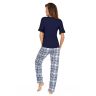 Пижама Loretta состоит из футболки и брюк. Футболка синего цвета с V-образным вырезом горловины. Брюки в клетку прямого кроя. Пижама упакована в плотный прозрачный пакет с изображением товара.