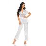 Элегантная атласная пижама белого цвета. Рубашка отделана нежным кружевом на рукавах и на талии. Длинные брюки с эластичным поясом. Изделие упаковано в красивую плотную коробку с изображением товара.