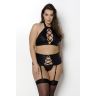 Комплект Nancy - это комплект из трех частей от Passion, который включает в себя застегивающийся на шее топ, пояс для чулок и смелые стринги. Все это выполнено из черной кожи с многочисленными пересекающимися полосками. Чулки в комплект не входят.