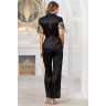 Комплект из брюк и жакета Mia-Amore выполнен из смесового шёлка. Жакет с центральной застежкой на пуговицы и короткими цельнокроеными рукавами, декорированными по низу широким кружевом с фестонам и орнаментом. Спереди на жакете накладной кармашек, декорированный также моновышивкой по сетке.