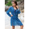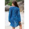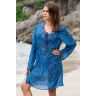 Короткая туника Mia-Amore с длинным рукавом выполнена из принтованного шифона в морской синей гамме, горловина и низ рукавов оформлены бисером и паетками, глубокий вырез горловины украшает шнуровка.