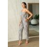 Комбинезон брючный женский, длинный с карманами, из принтованной вискозы. Ассиметричное решение верха, короткий цельнокроеный, спущенный рукав на правое плечо и бретель на левое плечо из основного полотна с регулировкой. Верхняя и нижняя часть соединённые по линии талии. Пояс-кулиска на эластичной тесьме. Крой брюк свободный, прямой