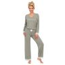 Однотонная пижама Simply стильного оливкового цвета состоит из лонгслива и прямых брюк. Лонгслив с длинным рукавом и v-образным вырезом. Лонгслив и брюки оформлены изящным кружевом.