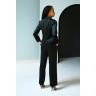 Комплект состоит из жакета и длинных брюк из натурального 100% шёлка. Жакет полуприлегающего покроя с застежкой на пуговицы и отложным воротником, рукав втачной на манжете. Длинные брюки свободного покроя на эластичной тесьме (резинке) в поясе, с карманами в боковых швах.