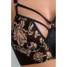 Комплект Victoria выполнен из качественного материала, которое идеально садится по фигуре. Черный атлас покрыт оригинальным золотым узором. Бюстгальтер на косточках мягко приподнимает грудь. Их округлость дополнительно подчеркивается полосами, которые являются дополнительным элементом, украшающим вырез. Трусы привлекают внимание тем же рисунком, что и на бюстгальтере.
