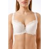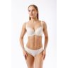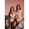 Бюстгальтер на поролоне и на каркасах. Выполнен из эластичного кружева и эластичного полотна. На стане бюстгальтера вертикальные упругие, корректирующие пластины, позволяющие прилегать к телу и не скручиваться боковой части бюстгальтера. Украшение бантик с камнем.