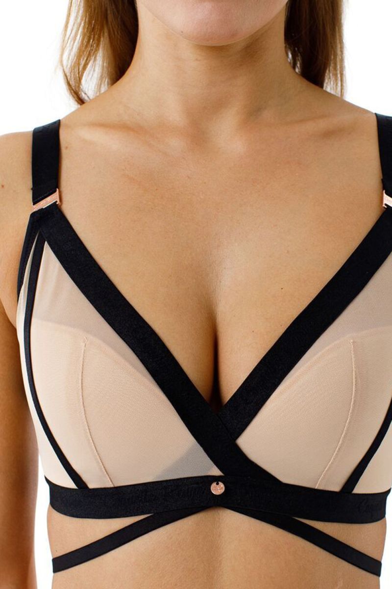 Бюстгальтер топ без каркасов с боковыми пластинами. Выполнен из эластичной сетки и мягких поролоновых чашек, обеспечивает естественную поддержку. Элемент декора тонкая резинка с застежкой на спине. Украшение: медальон с логотипом COQUETTE REVUE.