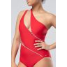 Женский слитный купальник ассиметричного кроя, на правое плечо. Яркую красную ткань купальника «разрезают» по диагонали две серебряные молнии, которые можно расстегнуть на желаемую длину, обнажив эротично фигуру. Эта авангардная модель имеет подкладку по всему объему и встроенные формированные чашечки для создания идеального силуэта.
