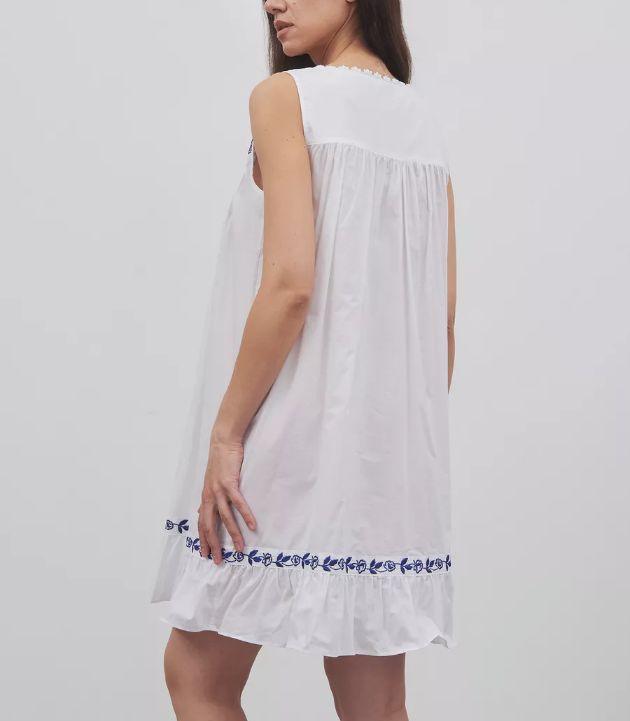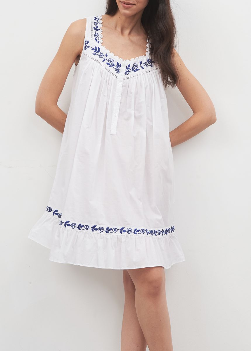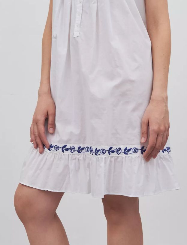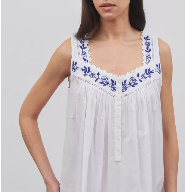Короткая ночная сорочка Eileen West (США) без рукавов изготовлена из 100%хлопка-батиста. Бретели, кокетка и низ сорочки отделаны вышивкой, на груди застежка на пуговицах.