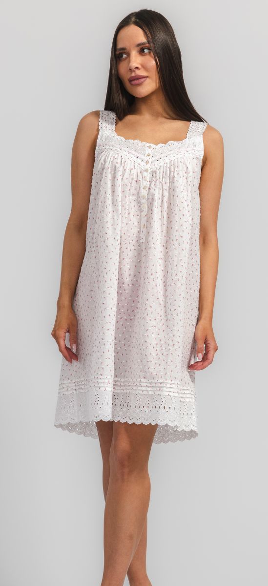 Короткая ночная сорочка Eileen West (США) без рукавов изготовлена из 100%хлопка-батиста. Бретели, кокетка и низ сорочки отделаны кружевом, на груди застежка на пуговицах.