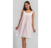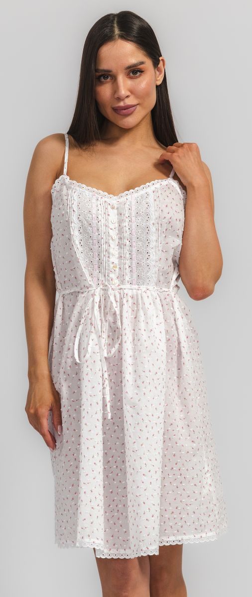 Короткая ночная сорочка на бретелях Eileen West (США) без рукавов изготовлена из 100% хлопка-батиста. Перед и низ сорочки отделаны кружевом, на груди застежка на пуговицах, по линии талии узкий пояс.