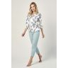 Женская пижама Flavia из воздушной приятного на ощупь, мягкого трикотажа. Кофта с цветочным принтом, с рукавом 3/4 и круглым вырезом горла, декорирована по бокам разрезами. Укороченные брюки с мягкой резинкой в поясе. по ширине регулируются внутренним шнурком.