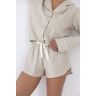 Пижама Allison бежевого цвета состоит из рубашки и брюк. Рубашка на пуговицах. Шорты на широкой резинке. Декорированы бантиком на поясе. Идеальный вариант не только для сна, но и для домашнего отдыха.