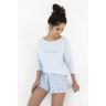 Хлопковая пижама Angela состоит из голубого лонгслива с надписью на груди и шорт с рюшами. Лонгслив свободного кроя с рукавами 3/4 и круглым вырезом горловины. Шорты на мягкой широкой резинке. Идеальный вариант не только для сна, но и для домашнего отдыха.