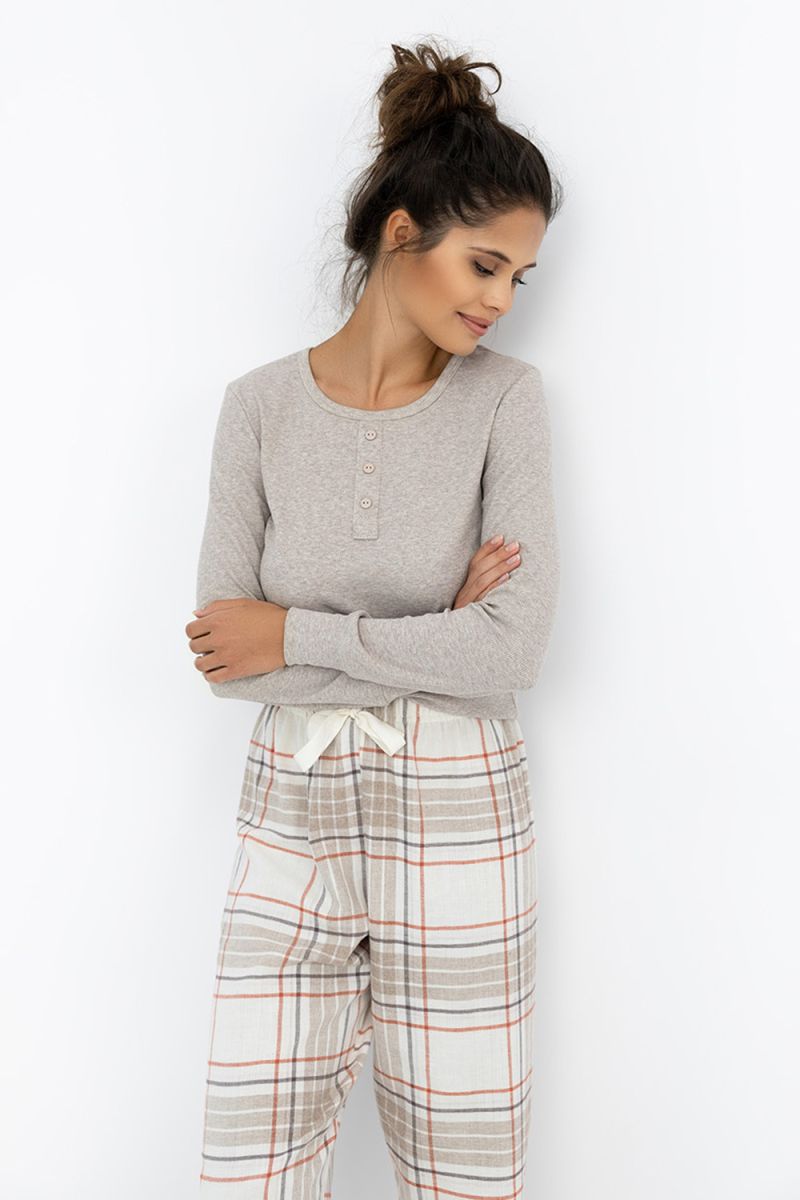 Повседневный домашний комплект Angelina состоит из лонгслива "в рубчик", с воротником на кулиске и прямых брюк в "клетку". Рукава лонгслива оформлены манжетами. Идеальный вариант не только для сна, но и для домашнего отдыха. Состав брюк: хлопок 90%, полиэстер 10%.