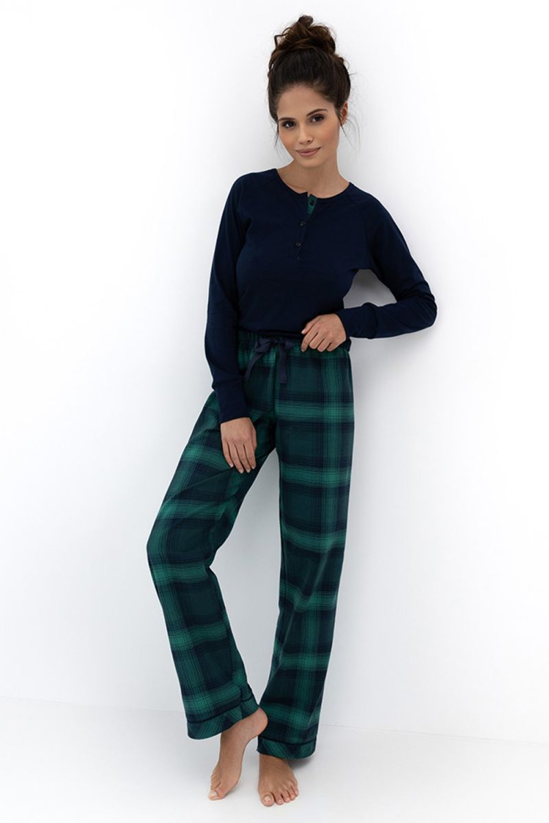 Пижама Cassandra состоит из прямых брюк и однотонного лонгслива с длинным рукавом. Брюки в крупную "клетку", пояс декорирован контрастным бантиком. Идеальный вариант не только для сна, но и для домашнего отдыха.
