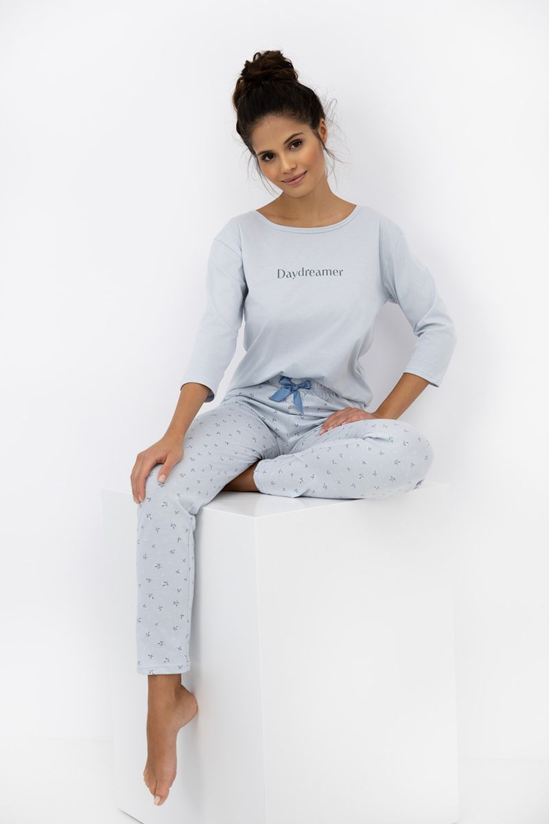 Повседневная пижама Daydreamer состоит из лонгслива и зауженных брюк. На груди надпись, брюки оформлены мелким растительным принтом. Вырез горловины круглый, широкий. Идеальный вариант не только для сна, но и для домашнего отдыха.