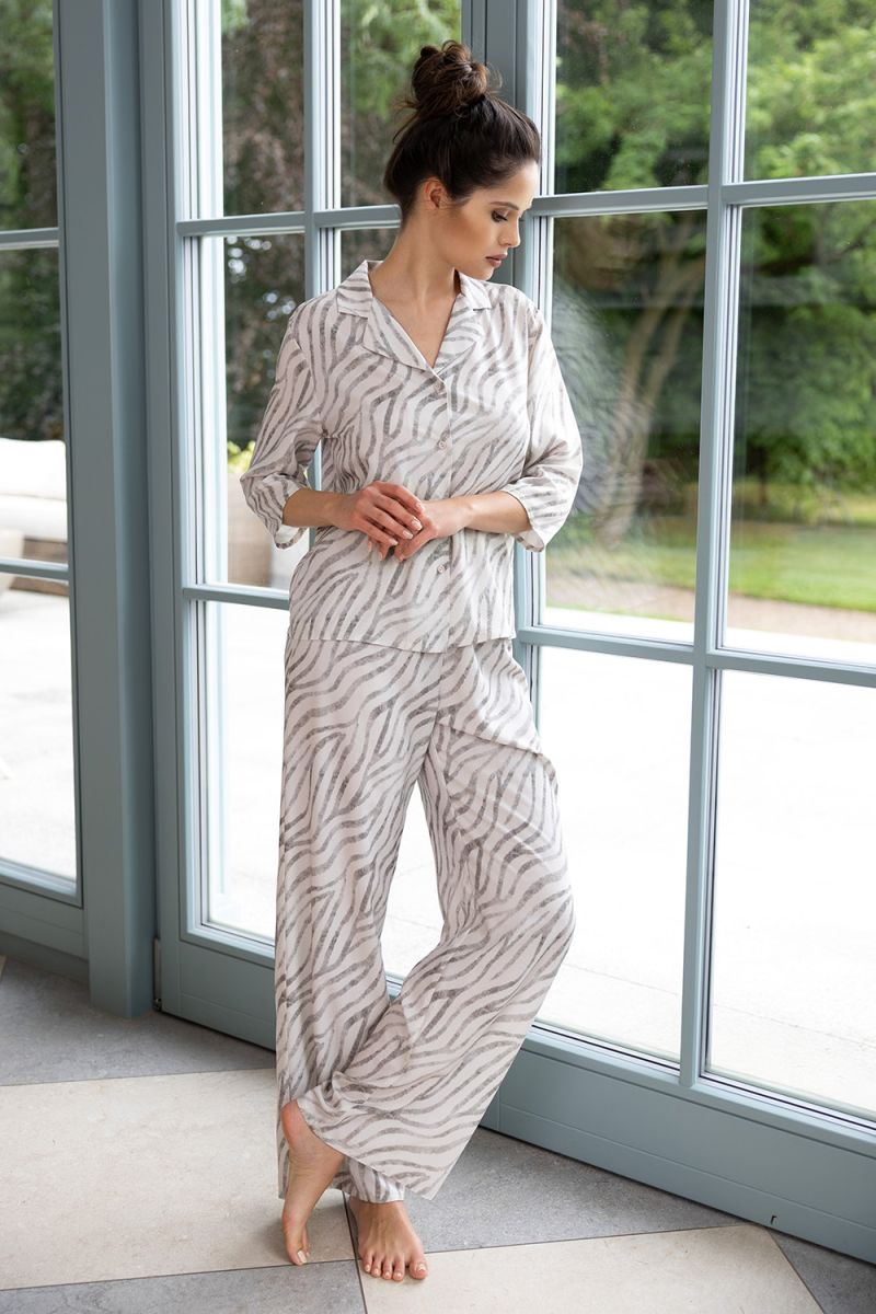 Повседневная пижама Emory состоит из рубашки и брюк прямого кроя. Рубашка с рукавами 3/4, на пуговицах. Материал декорирован паттерном абстрактным принтом. Идеальный вариант не только для сна, но и для домашнего отдыха.
