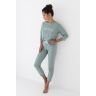 Пижама Garden пудрового зеленого цвета. Состоит из лонгслива и брюк. Лонгсив свободного силуэта и с рукавами 3/4. Брюки зауженные к низу, на широкой резинке. Декорированы бантиком на поясе. Идеальный вариант не только для сна, но и для домашнего отдыха.