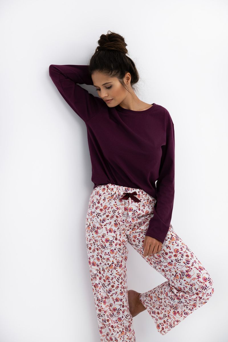 Пижама Heidi состоит из прямых брюк белого цвета с цветочным принтом и однотонного лонгслива с длинными рукавами. Брюки на широкой резинке, декорированы контрастным бантиком. Идеальный вариант не только для сна, но и для домашнего отдыха.