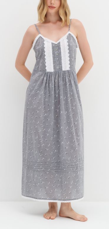 Длинная ночная сорочка Eileen West (США) без рукавов на тонких бретельках изготовлена из 100% хлопка-батиста. Лиф сорочки отделан кружевом и декорирован защипами, по низу изделия оборка.