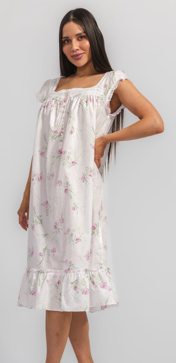 Ночная сорочка Eileen West (США) с рукавом, средней длины изготовлена из хлопка-батиста. Кокетка и рукава изделия декорированы кружевом, на груди застежка на пуговицах. По низу сорочки оборка.