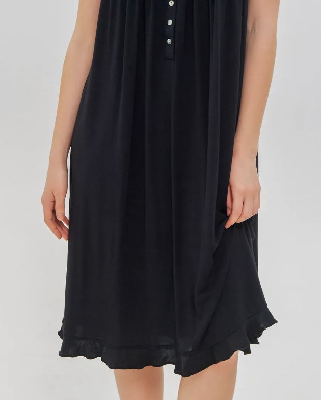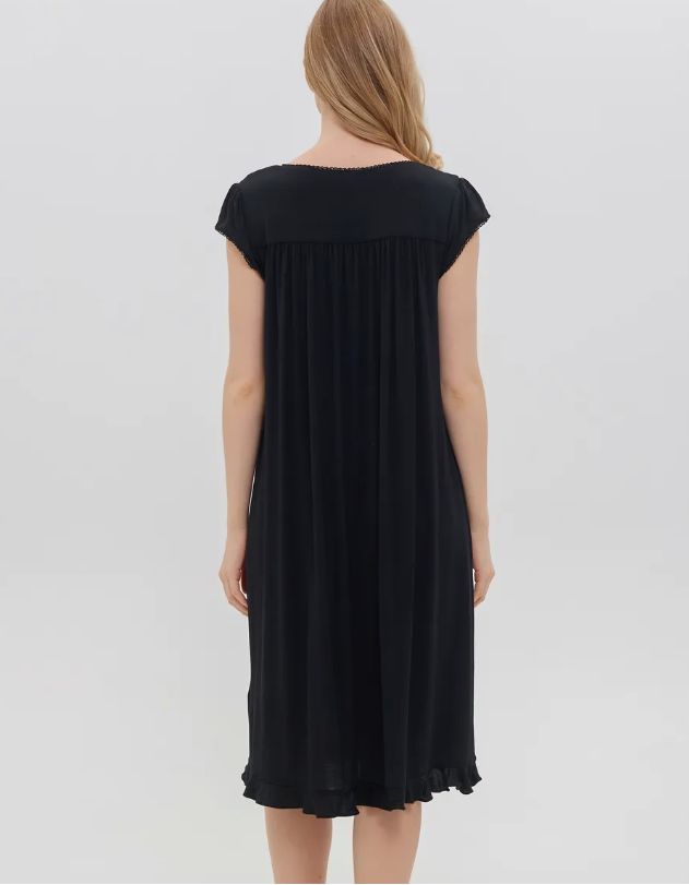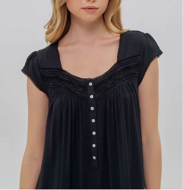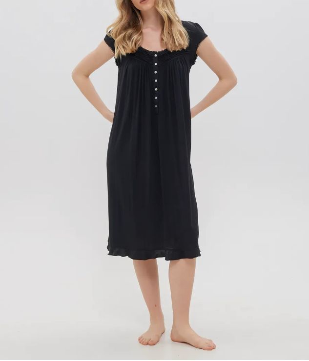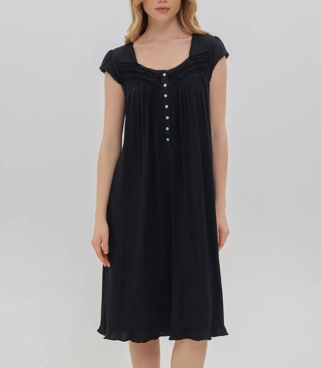 Ночная сорочка Eileen West (США) с коротким рукавом изготовлена из модала. Кокетка декорирована кружевом, на груди застежка на пуговицах. По низу сорочки оборка.