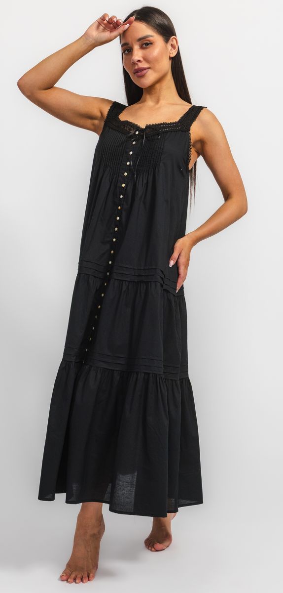 Длинная ночная сорочка Eileen West (США) без рукавов с защипами на груди изготовлена из 100% хлопка-батиста. Бретели и пройма отделаны кружевом. Застежка на пуговицы по всей длине изделия. По низу изделия два широких волана.