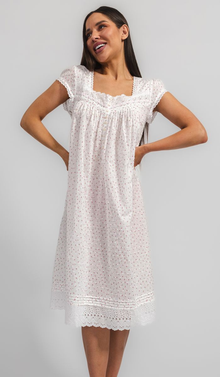 Ночная сорочка Eileen West (США) с рукавом, средней длины изготовлена из хлопка-батиста. Кокетка, рукава и низ изделия декорированы кружевом, на груди застежка на пуговицах.