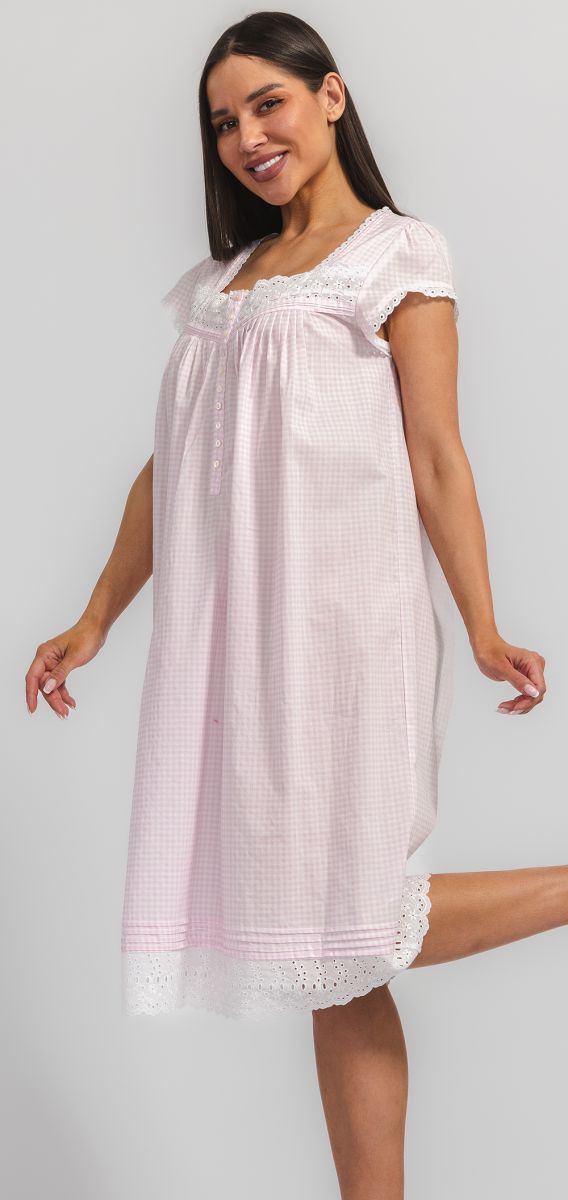 Ночная сорочка Eileen West (США) с рукавом, средней длины изготовлена из хлопка-батиста. Кокетка, рукава и низ изделия декорированы кружевом, на груди застежка на пуговицах.