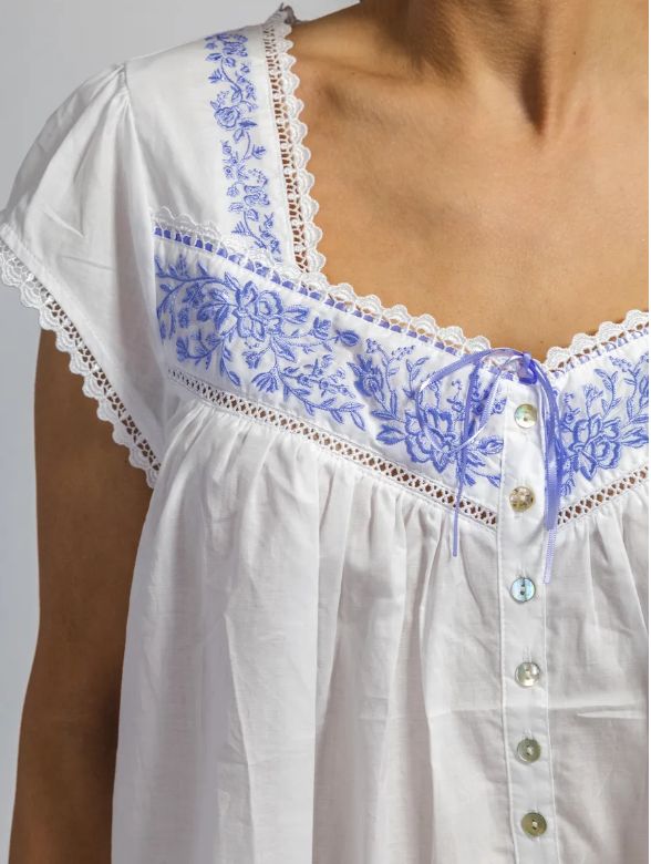 Ночная сорочка Eileen West (США) с рукавом, средней длины изготовлена из хлопка. батиста Кокетка и низ изделия декорированы вышивкой, на груди застежка на пуговицах. По низу сорочки оборка.