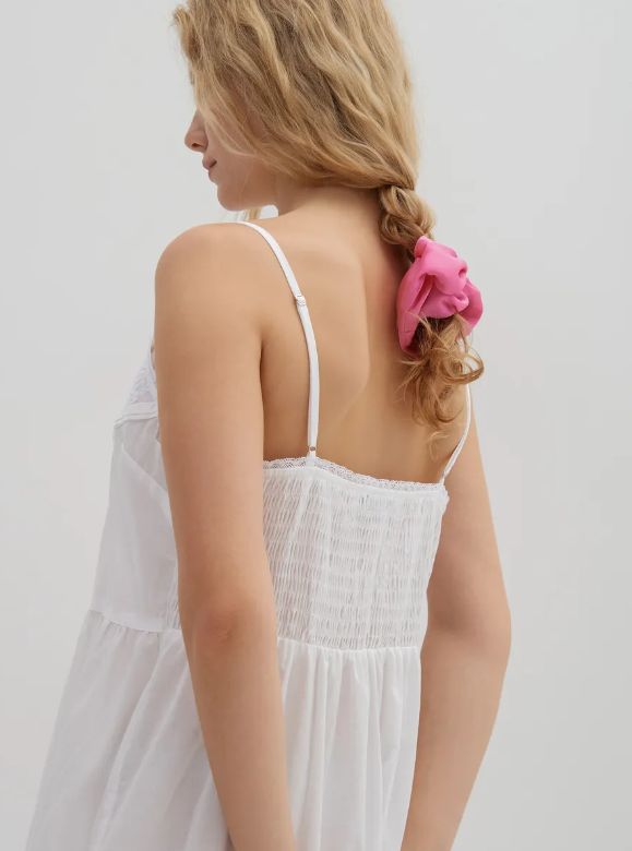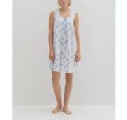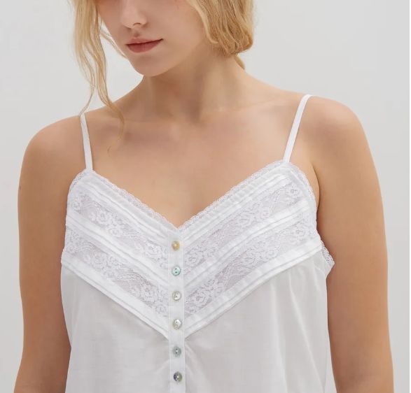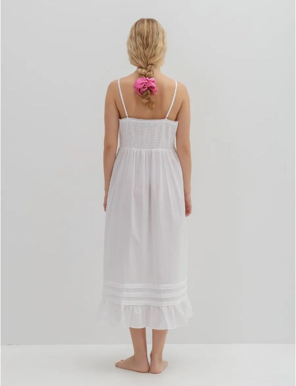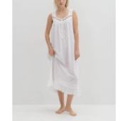 Длинная ночная сорочка Eileen West (США) без рукавов на тонких бретельках изготовлена из 100% хлопка-батиста. Лиф сорочки отделан кружевом и декорирован защипами, по низу изделия оборка.