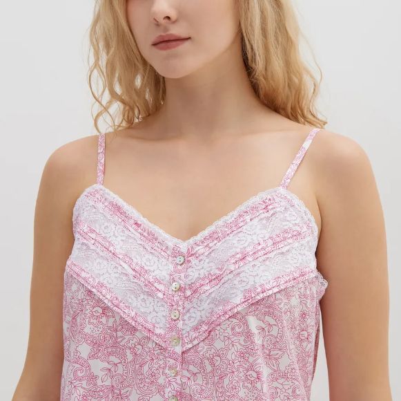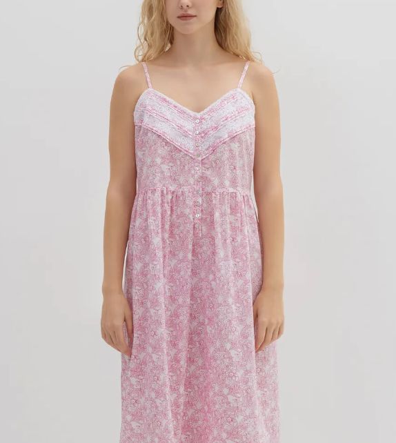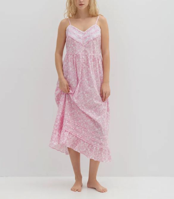 Длинная ночная сорочка Eileen West (США) без рукавов на тонких бретельках изготовлена из 100% хлопка-батиста. Лиф сорочки отделан кружевом и декорирован защипами, по низу изделия оборка.