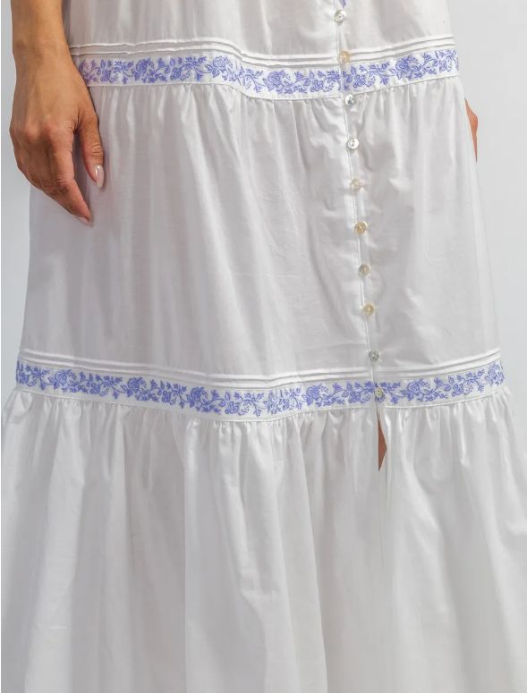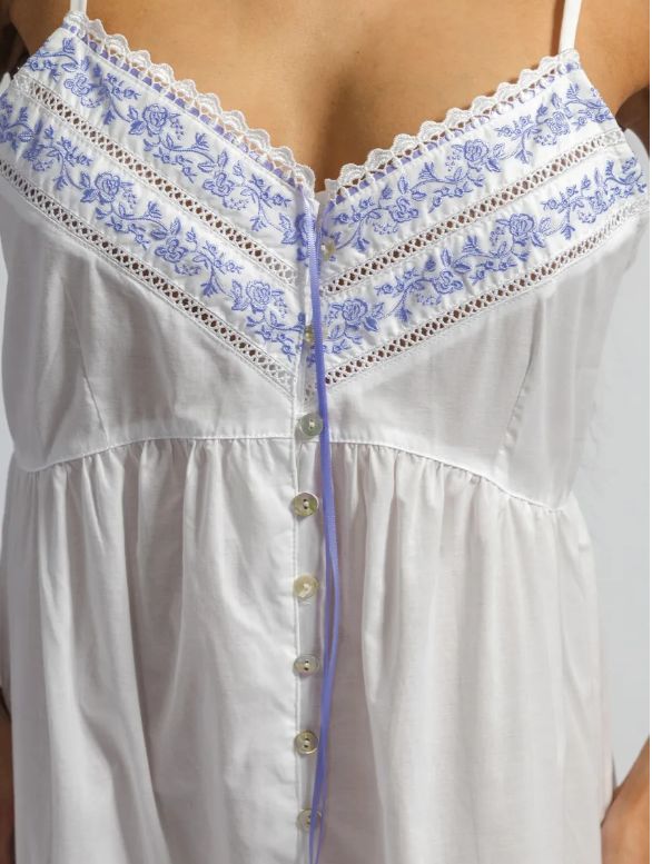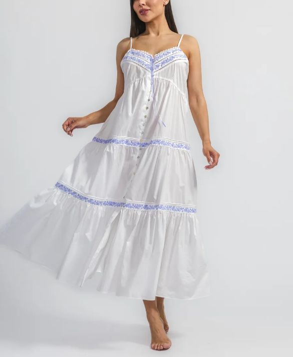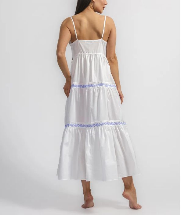 Длинная ночная сорочка Eileen West (США) без рукавов на тонких бретельках изготовлена из 100% хлопка-батиста. Лиф сорочки и воланы декорированы контрастной вышивкой.