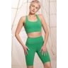 Женский спортивный топ-бра сочного зеленого цвета. Имеет встроенные съемные поролоновые чашки. Широкая плотная резинка под грудью обеспечивает поддержку. Затейливое переплетение прорезиненных лент на спинке – интересный акцент.