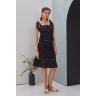 Черная юбка А-силуэта средней длины. Хлопковая ткань кроше с оригинальным флористическим рисунком в сочетании с дизайнерской тесьмой в виде колец создают неповторимый образ. Изделие отличается женственностью и утонченностью и подойдет, как для долгих летних прогулок, так и для вечерних свиданий.